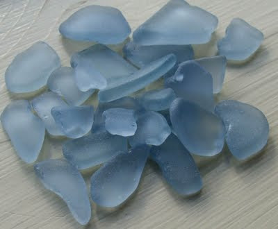 A few highlights of the day included a large bright turquoise oval bead (pictured above) in perfect condition-- with the hole intact and free of sand-- a nice find, and in a rare color. I also found a nice aquamarine "cat's eye" glass marble, a larger piece of pastel yellow (the only "rare" colored piece of the day) and a large (about 1 1/2" long) clear "egg" piece. I can only speculate as to its origins-- perhaps a finial or "knop" from some kind of glass serving dish? It was perfectly symmetrical, and in lovely frosted condition. Who says clear sea glass can't be interesting?!?!