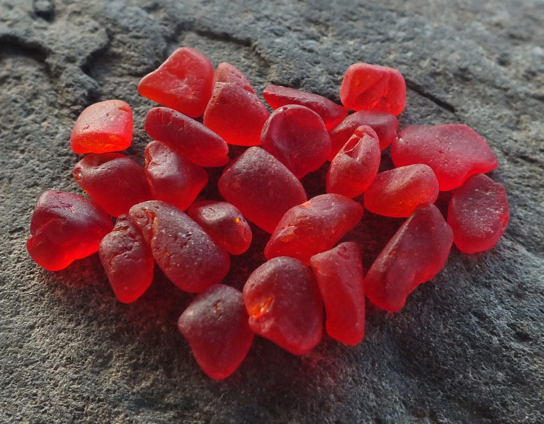 | A pile of red seaglass-- bright, but all pieces are quite tiny |